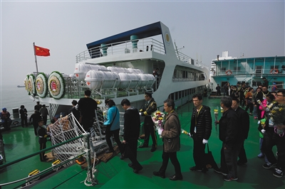 2018年4月2日,天津市濱海新區(qū)國際郵輪母港碼頭,全國首艘骨灰海撒專用船“國賓9號”首航,來自北京的逝者親屬們正排隊(duì)登船。新京報(bào)記者 王飛 攝