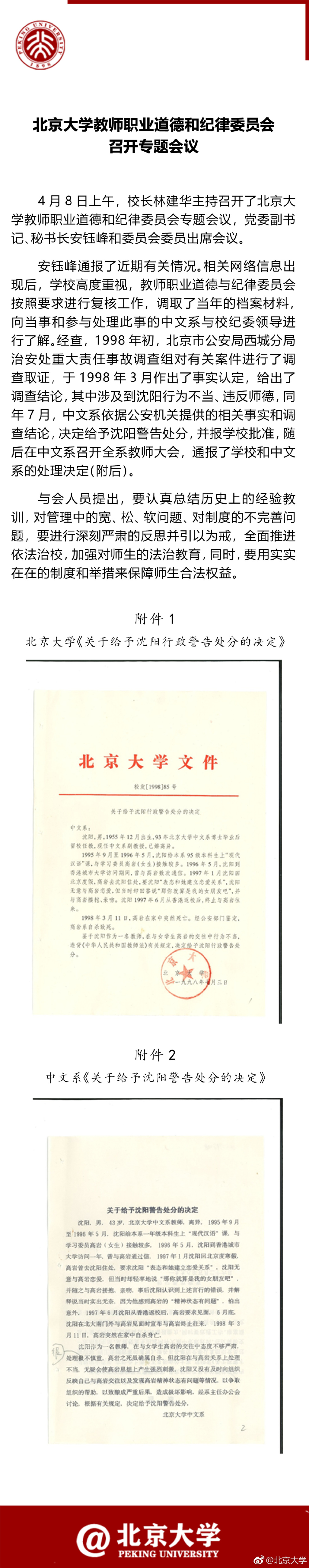 據(jù)北京大學官方微博消息,北京大學教師職業(yè)道德和紀律委員會今日召開專題會議 ,通報“沈陽事件”,并出示了當年對其警告處分的決定。