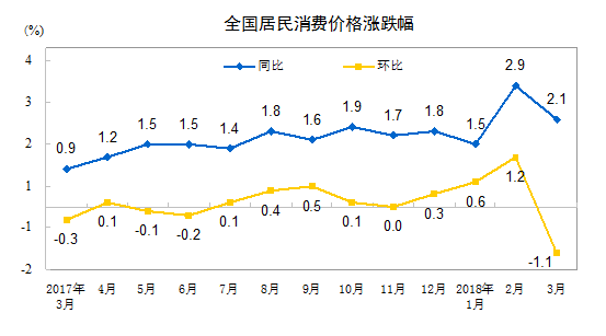 2018年3月份,全國(guó)居民消費(fèi)價(jià)格同比上漲2.1%。其中,城市上漲2.1%,農(nóng)村上漲1.9%;食品價(jià)格上漲2.1%,非食品價(jià)格上漲2.1%;消費(fèi)品價(jià)格上漲1.6%,服務(wù)價(jià)格上漲2.8%。一季度,全國(guó)居民消費(fèi)價(jià)格總水平比去年同期上漲2.1%。