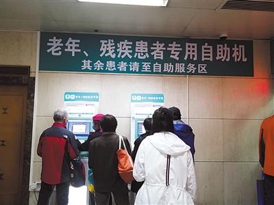 昨日,同仁醫(yī)院一樓門診大廳,老年人正在使用專用自助機(jī)。新京報(bào)記者 戴軒 攝 圖片來(lái)源:新京報(bào)
