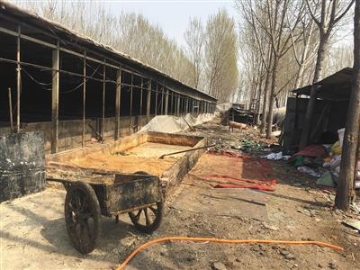 大院除了破敗的大棚,沒有任何養(yǎng)殖設(shè)施。新京報(bào)記者現(xiàn)場看到,一名養(yǎng)殖戶把清理出的糞便和污水裝進(jìn)小推車,然后倒進(jìn)院后的一條水溝里。