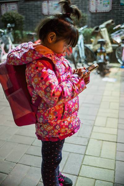 1月19日,在濟南實驗初中校門外,一位和姑姑來等表姐放學的小女孩,背著幼兒園的小書包,站在那里低頭聚精會神地玩著姑姑的手機。
