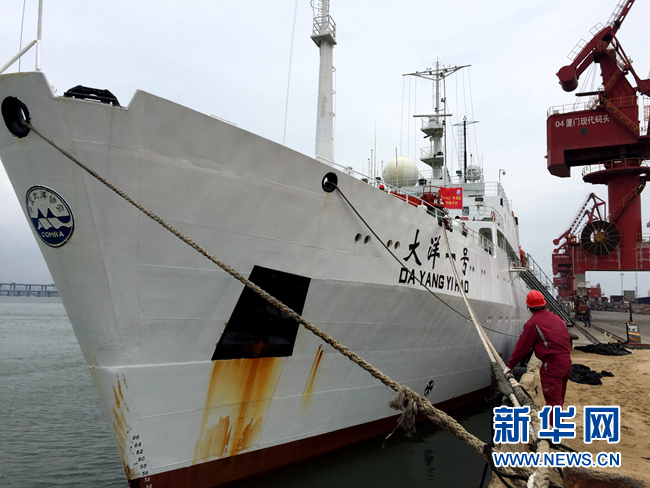 ??? 這是4月15日拍攝的??吭趶B門現(xiàn)代碼頭的“大洋一號”科考船。當日,搭載“潛龍三號”無人無纜潛水器和70名科考隊員的“大洋一號”科考船從廈門起航,奔赴南海執(zhí)行“大洋一號”綜合海試B航段科考任務。這也是目前我國最先進的自主無人潛水器“潛龍三號”首次出海。新華社記者 劉詩平 攝