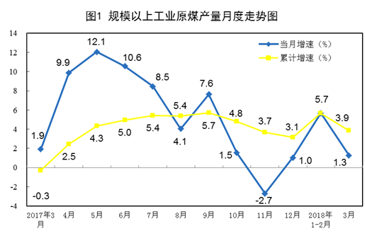一季度,原煤產(chǎn)量8.0億噸,同比增長3.9%。3月份,原煤產(chǎn)量同比增長1.3%,比1-2月份回落4.4個百分點(diǎn)。