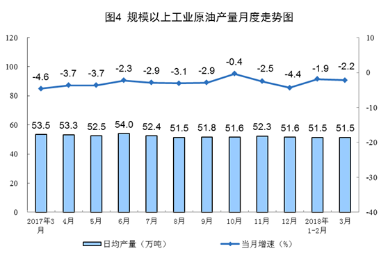 一季度,原油產(chǎn)量4633萬噸,同比下降2.0%,降幅比去年同期收窄4.8個百分點(diǎn)。3月份,原油生產(chǎn)同比下降2.2%,日均產(chǎn)量51.5萬噸。