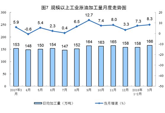 受去年下半年國內(nèi)新增煉化產(chǎn)能陸續(xù)投產(chǎn)和2018年首批原油進(jìn)口配額大幅增加影響,一季度原油加工量明顯增長,同比增長7.5%,增速比去年同期加快3.0個百分點(diǎn)。3月份,原油加工量同比增長8.3%,日均加工166.2萬噸,為歷史最高水平。其中,汽油、煤油和柴油產(chǎn)量分別增長5.7%、14.6%和1.3%。