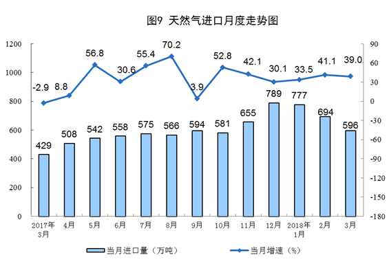 天然氣進(jìn)口高速增長。一季度,進(jìn)口天然氣2062萬噸,同比增長37.3%。3月份,進(jìn)口天然氣596萬噸,同比增長39.0%,增速比1-2月份放緩2.1個百分點(diǎn)。