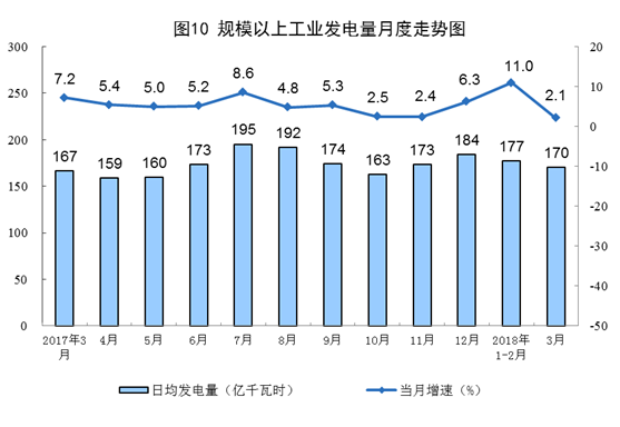 一季度發(fā)電1.6萬億千瓦時,發(fā)電量快速增長,同比增長8.0%,增速比去年同期加快1.3個百分點(diǎn)。3月份,全國平均氣溫較常年同期偏高2.9℃,而去年同期氣溫接近常年,且本月較去年同期少1個工作日,受此影響,發(fā)電量增速有所回落,同比增長2.1%。