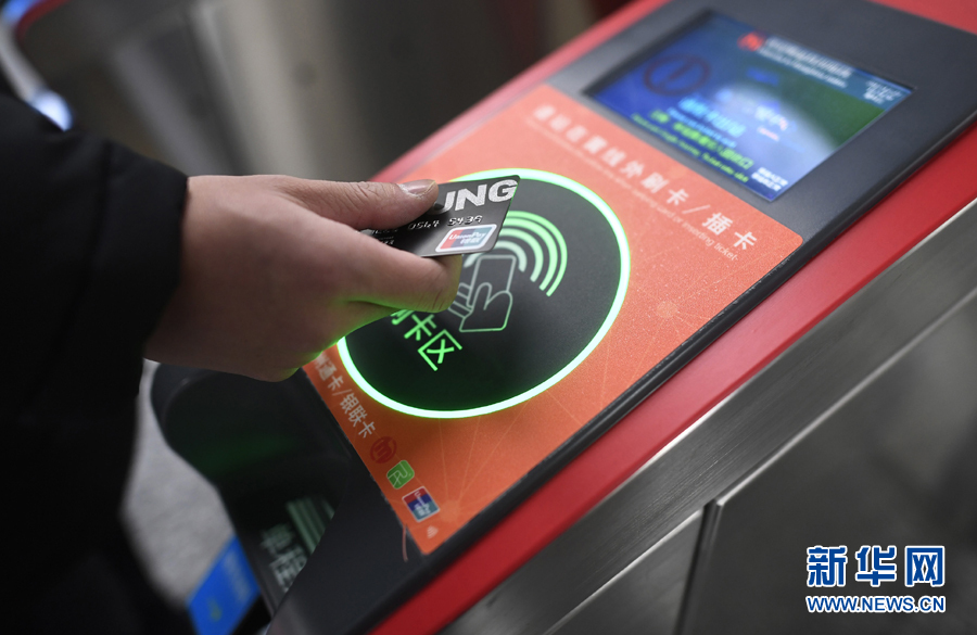 乘客在杭州地鐵豐潭路站體驗(yàn)使用帶有閃付功能的銀聯(lián)IC卡過(guò)閘乘車(chē)(2017年12月27日攝)。新華社記者 黃宗治 攝