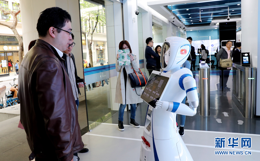 一位市民在位于上海九江路的無(wú)人銀行入口處向迎賓機(jī)器人說(shuō)明需要辦理的業(yè)務(wù)種類(lèi)(4月12日攝)。近日,中國(guó)建設(shè)銀行在上海九江路開(kāi)出國(guó)內(nèi)首家無(wú)人銀行。新華社記者 方喆 攝
