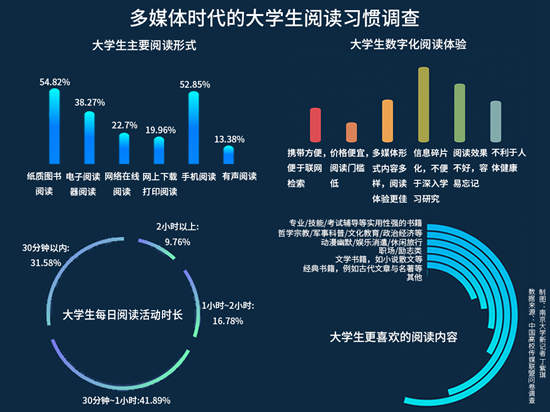 調查結果顯示,54.82%受訪大學生閱讀仍以紙質圖書為主,38.27%的受訪者選擇使用電子閱讀器,52.85%的受訪大學生選擇使用手機進行閱讀。值得一提的是,13.38%受訪大學生偏愛有聲閱讀,具體方式包括收聽錄音帶講書、微信語音推送、使用語音讀書機或有聲類App。
