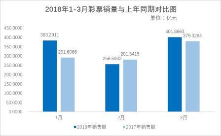 據(jù)財政部網(wǎng)站消息,3月份,全國共銷售彩票401.87億元,比上年同期(簡稱“同比”)增加22.54億元,增長5.9%。1月至3月累計,全國共銷售彩票1041.75億元,同比增加89.27億元,增長9.4%。