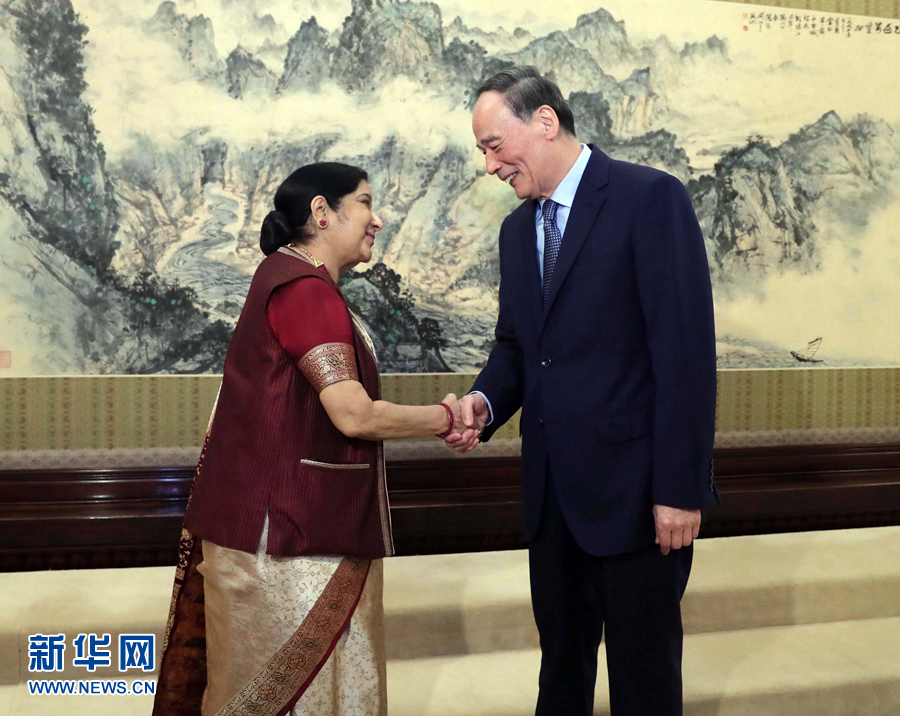 4月23日,國(guó)家副主席王岐山在北京中南海會(huì)見印度外長(zhǎng)斯瓦拉杰。新華社記者劉衛(wèi)兵攝