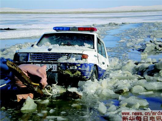 ▲2006年11月13日,達賚湖公安分局執(zhí)勤車輛在冰面上遇險?!∈茉L者供圖