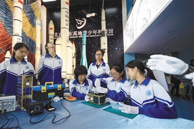 昨日,北京市東高地青少年科技館,學(xué)生在練習(xí)拆裝1:1衛(wèi)星模型。新京報記者 王嘉寧 攝