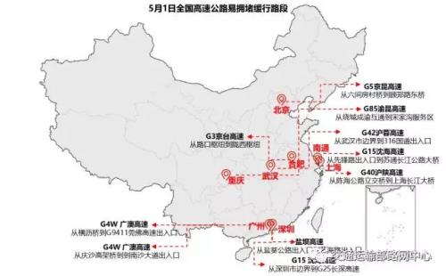 5月1日,全國(guó)高速路易擁堵緩行路段。來(lái)自交通部路網(wǎng)中心微信公號(hào)。