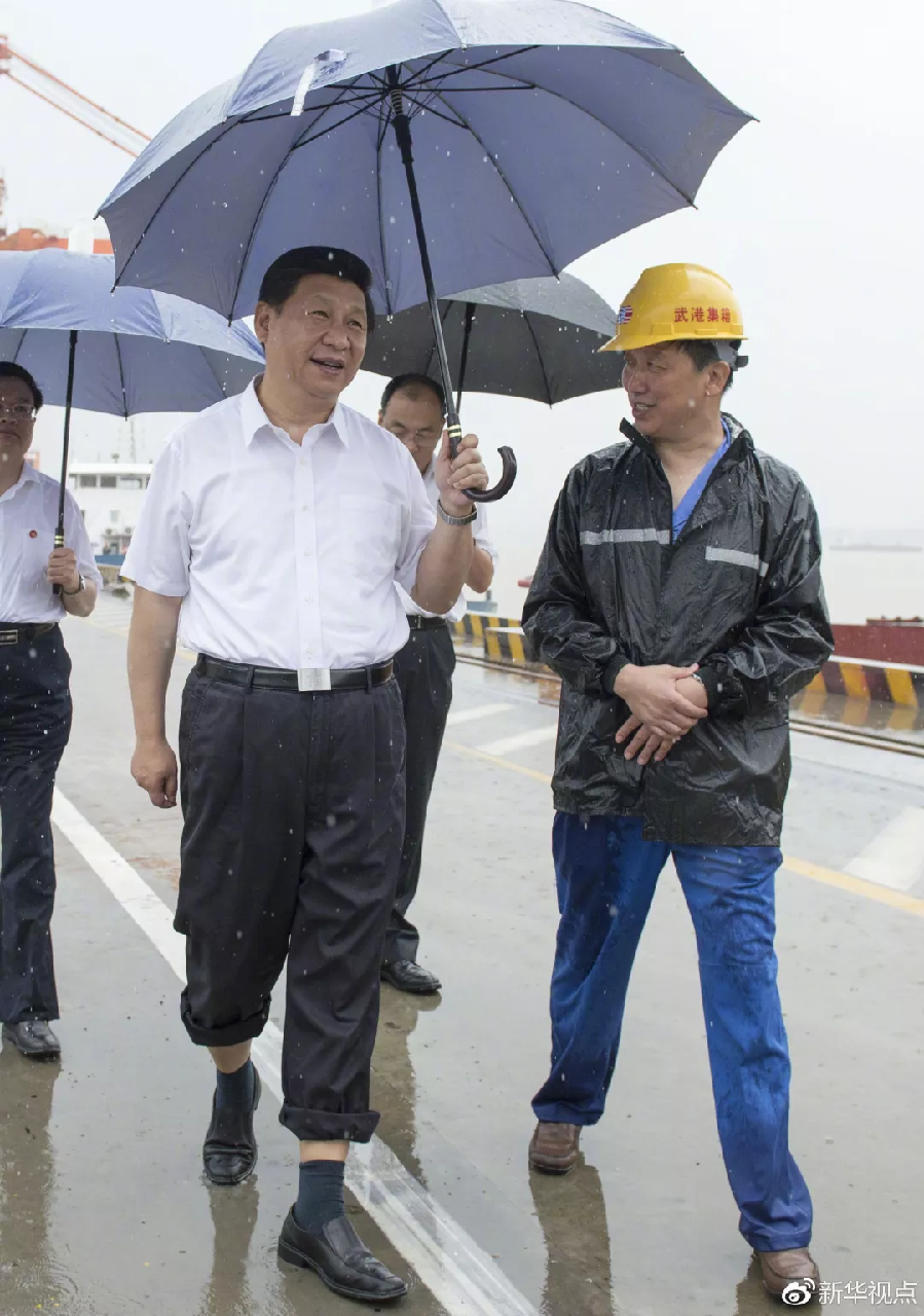 荊楚大地,江河縱橫。2013年7月21日上午,習(xí)近平冒著大雨前往武漢新港陽(yáng)邏集裝箱港區(qū),卷起褲腿,打著雨傘,趟著積水,了解港口貨物吞吐量情況。他強(qiáng)調(diào),長(zhǎng)江流域要加強(qiáng)合作,充分發(fā)揮內(nèi)河航運(yùn)作用,發(fā)展江海聯(lián)運(yùn),把全流域打造成黃金水道。