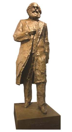 展廳入口處,一尊兩米多高的馬克思雕像,仿佛迎面向觀眾走來。這座由著名雕塑家、中國美術(shù)館館長吳為山創(chuàng)作的雕塑,栩栩如生地展現(xiàn)了馬克思的音容笑貌——目光深邃、從容淡定,傳遞著堅(jiān)定前行的力量。
