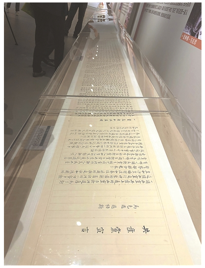 展廳中,一幅由5位江蘇書法家集體創(chuàng)作的22米長的《共產(chǎn)黨宣言》書法長卷,展示著《共產(chǎn)黨宣言》震撼人心的力量,同樣吸引了不少觀眾的目光。這幅小楷長卷有近一萬五千個(gè)漢字,由江蘇書法家孫曉云、王衛(wèi)軍、謝少承、張守躍、黃繼革聯(lián)合創(chuàng)作,在氣勢恢宏中傳遞著中華傳統(tǒng)書法的優(yōu)美。據(jù)悉,這也是國內(nèi)首次以中國傳統(tǒng)書法藝術(shù)形式詮釋馬克思主義經(jīng)典著作。