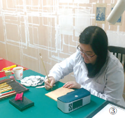 無影燈下,大大小小的毛筆、毛刷整齊排列,調(diào)色盤中墨色深淺不一,一臺(tái)小型分色測(cè)試儀隨時(shí)“待命”;桌上有根據(jù)文物原件打印出來的精細(xì)放大圖像和色彩分析數(shù)據(jù);右手邊是帶有通風(fēng)裝置的操作臺(tái);房間盡頭處有帶過濾架的水槽,專供清洗印染后的紙張……