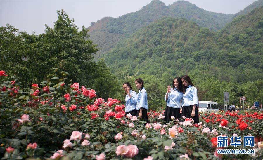 來自成都的大學(xué)生在位于四川綿竹市的“中國玫瑰谷”游覽拍照(4月18日攝)。新華社記者 張帆 攝