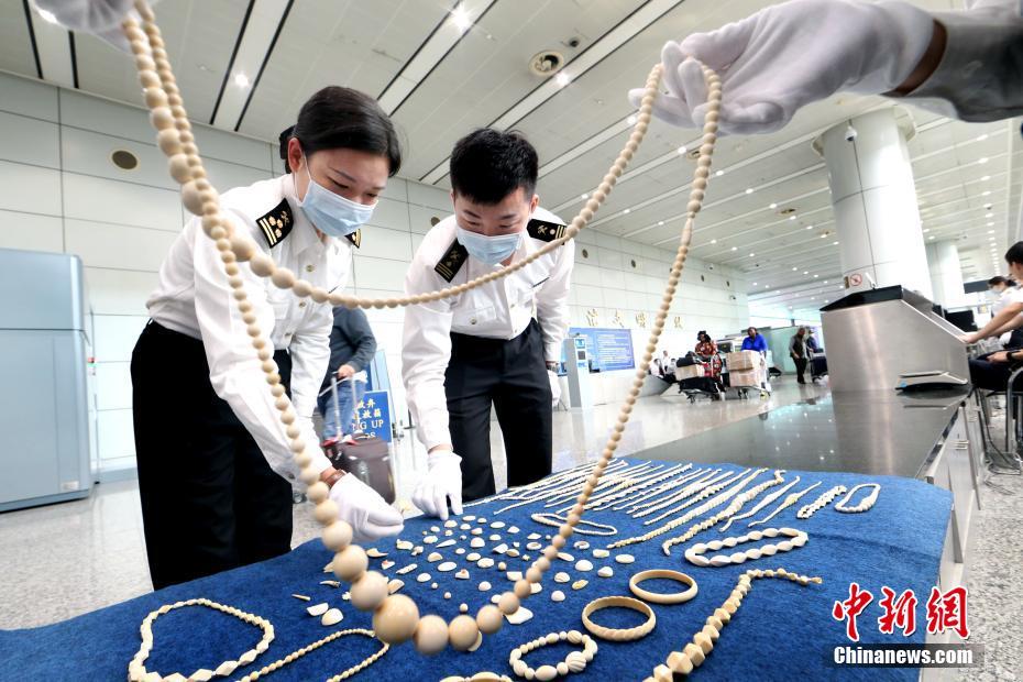 4月11日,廣州海關(guān)通報,1-3月,該關(guān)在空港旅檢渠道共查獲象牙走私案件62宗,涉及象牙及制品24.16千克,同比分別增長1.38倍、2倍。圖為近日海關(guān)關(guān)員清點(diǎn)查獲的走私象牙制品。中新社記者 池兆恩 攝