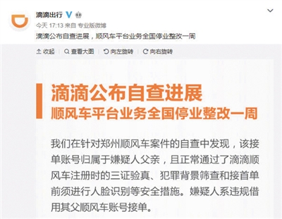 同日,滴滴公布鄭州順風(fēng)車案自查進(jìn)展,順風(fēng)車平臺(tái)業(yè)務(wù)全國(guó)停業(yè)整改一周。