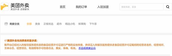 從哪里看違規(guī)餐飲店鋪公示情況?首先,打開三個(gè)外賣平臺(tái)的網(wǎng)頁(yè)版并登陸,選擇“北京地區(qū)”后,可以看到網(wǎng)頁(yè)最上端明顯位置發(fā)布了這樣的承諾:“我平臺(tái)已經(jīng)對(duì)入網(wǎng)餐飲服務(wù)提供者的食品經(jīng)營(yíng)許可證進(jìn)行嚴(yán)格的實(shí)地審查,并保證入網(wǎng)餐飲服務(wù)提供者食品經(jīng)營(yíng)許可證載明的經(jīng)營(yíng)者名稱、經(jīng)營(yíng)場(chǎng)所、主體業(yè)態(tài)、經(jīng)營(yíng)項(xiàng)目、有效期等許可信息合法、真實(shí)、準(zhǔn)確、有效。”
