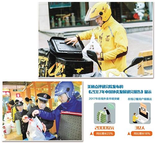 快節(jié)奏的都市生活、迅捷的網(wǎng)絡(luò)支付和日益發(fā)達(dá)的配送網(wǎng)絡(luò),催生了以“美團(tuán)外賣”“百度外賣”“餓了么”等為代表的網(wǎng)絡(luò)餐飲服務(wù)平臺(tái)。美團(tuán)點(diǎn)評(píng)研究院發(fā)布的《2017年中國外賣發(fā)展研究報(bào)告》顯示,2017年在線外賣市場突破2000億元,同比增長23%;在線訂餐用戶規(guī)模達(dá)3億人,同比增長18%。