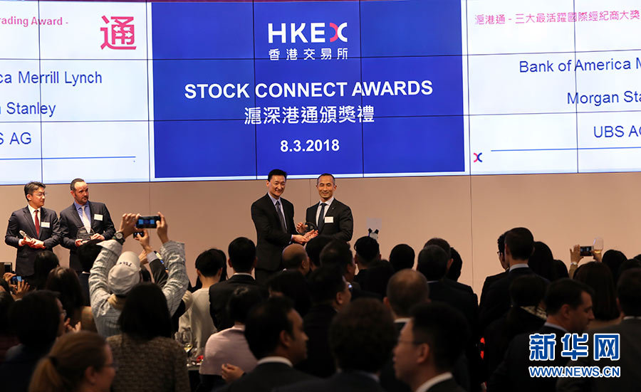 香港交易所舉辦2017年度“滬深港通”頒獎(jiǎng)禮,表揚(yáng)主要經(jīng)紀(jì)商于2017年參與“滬深港通”互聯(lián)互通股票交易機(jī)制所取得的成績(jī)(3月8日攝)。新華社記者 李鵬 攝