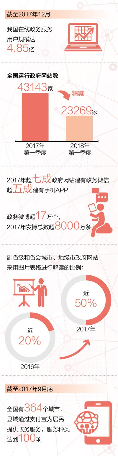 普查、抽查、整改、創(chuàng)新,這些年,全國政府網(wǎng)站“四不”問題基本解決,《政府網(wǎng)站發(fā)展指引》為網(wǎng)站怎么開辦提供高標準“施工圖”,網(wǎng)站管理水平和政務服務能力不斷提升。截至今年3月1日,全國運行政府網(wǎng)站數(shù)達23269家。相比2017年第一季度的43143家,不到一年時間,體量“精減”一半。其中,縣級以下政府網(wǎng)站1645家,相比2017年一季度減少九成多。