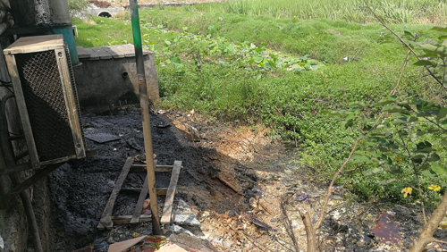 一家縣城周邊的農(nóng)莊,餐廚污水、廢棄物長時(shí)間排放到一個(gè)小水塘,堆滿了黑色或黃色的濕乎乎、粘稠狀污物,旁邊緊鄰著稻田和一條灌溉水渠。記者 白田田 攝