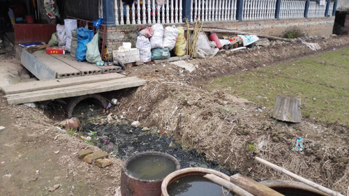 一個(gè)主打“土雞土菜”的農(nóng)家樂,餐廚廢水直接排到屋后的水渠,長年累月形成了黑色油膩的泥垢。記者 白田田 攝