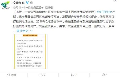 2018年5月29日下午,寧波市住建委會(huì)同部分屬地住建部門約談?chuàng)艽蝌}擾電話的房產(chǎn)開(kāi)發(fā)企業(yè)負(fù)責(zé)人,要求開(kāi)發(fā)企業(yè)立即停止這一騷擾行為,責(zé)令其限期整改,并處以暫停網(wǎng)簽、延緩發(fā)放預(yù)售許可證等相關(guān)處罰措施。