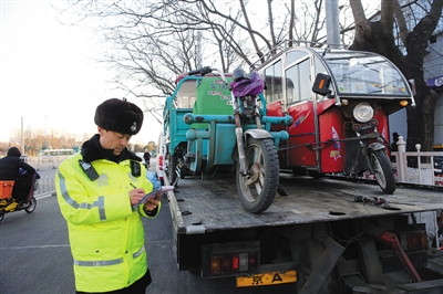 2017年12月13日,崇文門(mén)路口交警在登記被查扣上路行駛的非法機(jī)動(dòng)三輪車(chē)和電動(dòng)三輪車(chē)。新京報(bào)記者 王貴彬 攝