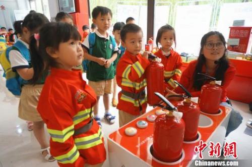 資料圖:兒童節(jié)孩子們穿上迷你消防服,體驗(yàn)?zāi)M滅火?!№n章云 攝