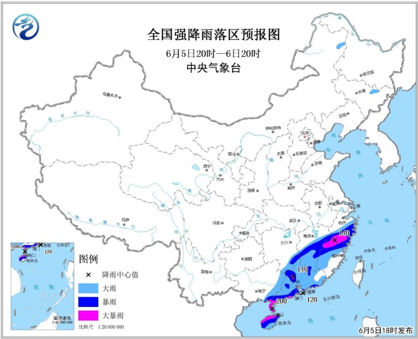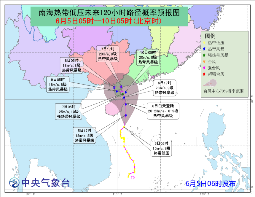 許映龍:南海的熱帶低壓于6月5日8時(shí)加強(qiáng)為今年第4號(hào)臺(tái)風(fēng)。5日16時(shí),第4號(hào)臺(tái)風(fēng)的中心位于海南省文昌市東偏南方向約85公里的海面上,中心附近最大風(fēng)力有8級(jí)(18米/秒)。目前,第4號(hào)臺(tái)風(fēng)以每小時(shí)20公里左右的速度向北偏西方向移動(dòng),并逐漸向我國(guó)海南東南部沿海靠近,并將于5日夜間至6日上午擦過或登陸海南東北部沿海(熱帶風(fēng)暴級(jí),20-23米/秒,8-9級(jí)),6日下午至7日早晨登陸廣東西部沿海(熱帶風(fēng)暴-強(qiáng)熱帶風(fēng)暴級(jí),20-25米/秒,8-10級(jí))。