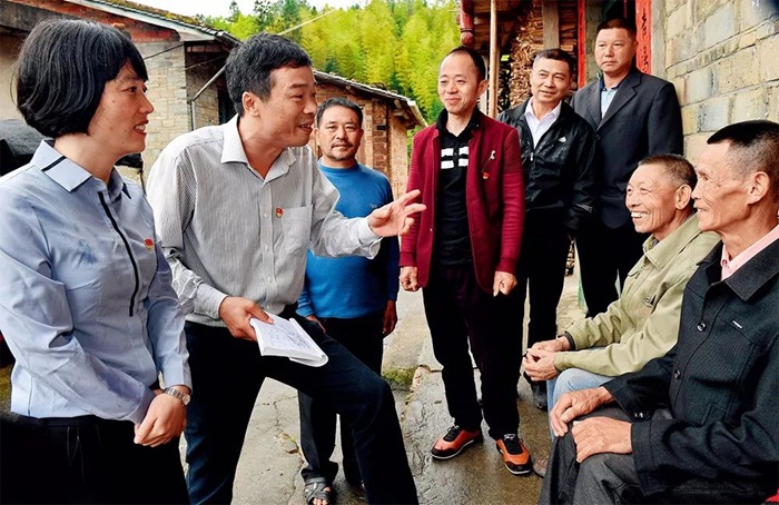 福建省邵武市紀檢干部(左一左二)在拿口鎮(zhèn)扁竹村向貧困戶了解生產(chǎn)生活以及扶貧資金發(fā)放情況 張國俊 攝