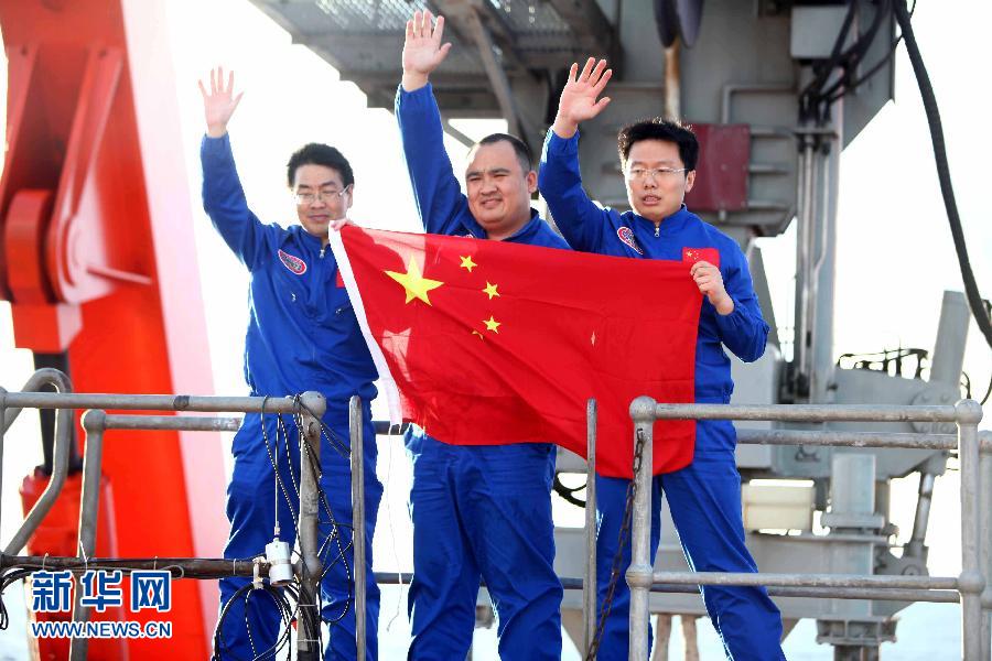 三位試航員走出“蛟龍”號(hào)載人潛水器后手舉國(guó)旗揮手致意(2012年6月24日攝)。 新華社記者 羅沙 攝