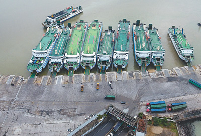 7日,廣東徐聞縣海安港碼頭,正在裝載客貨車(chē)的客滾船。新華社記者 楊冠宇 攝