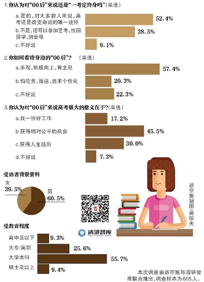 一年一度的高考剛剛落下帷幕。據(jù)教育部統(tǒng)計,今年全國共有975萬名考生參加高考,人數(shù)創(chuàng)下最近8年來的新高,比去年增加了35萬人。值得注意的是,今年參加高考的學生,大多也是在2000年出生的“千禧寶寶”。雖然說起來,其實所謂的“00后”,跟“80后”、“90后”,以及任何一種“后”,本質(zhì)上都沒有什么區(qū)別。在高考面前,在人生的關(guān)口面前,他們都是命運的“考生”。但是,時代不同,一代人也自有一代人不同的際遇。對此,我們需要關(guān)注什么?本期“京報調(diào)查”(新京報與清研智庫聯(lián)合推出)就此展開調(diào)查。