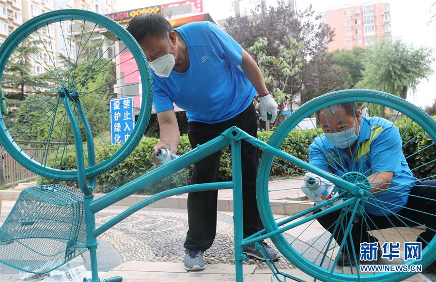 6月9日,豐臺(tái)區(qū)花鄉(xiāng)天倫錦城社區(qū)居民們?cè)诮o廢舊自行車(chē)噴漆。