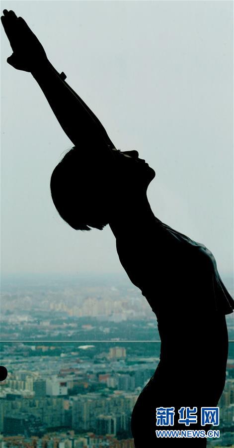 當日,數(shù)名瑜伽愛好者在專業(yè)瑜伽教練的帶領下在北京國貿(mào)大酒店70層以上的高樓層練習瑜伽,體驗高空練習瑜伽的樂趣。