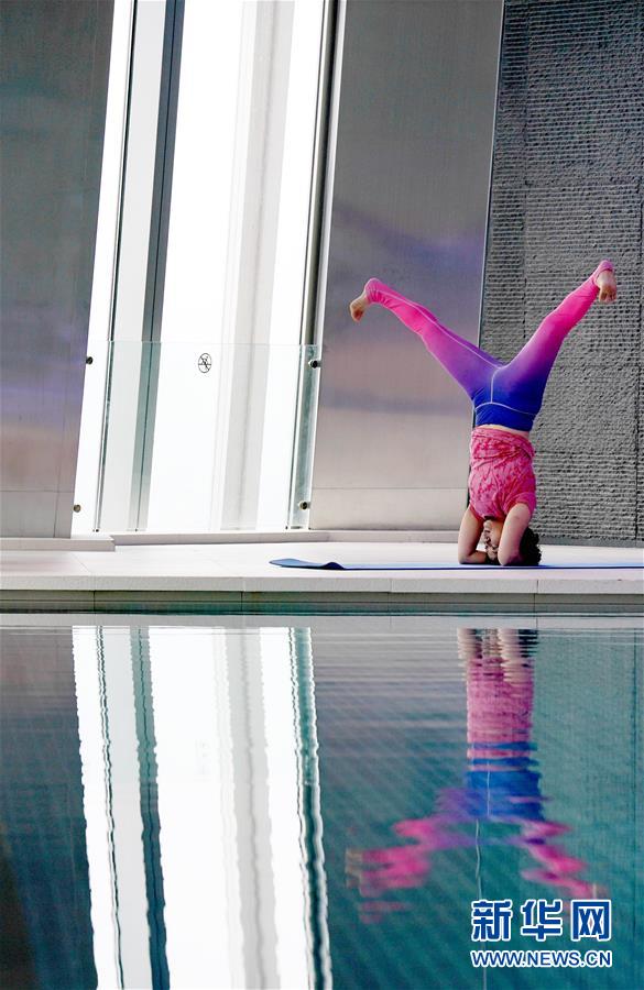 6月9日,在北京國(guó)貿(mào)大酒店78層游泳館,瑜伽愛好者練習(xí)瑜伽。