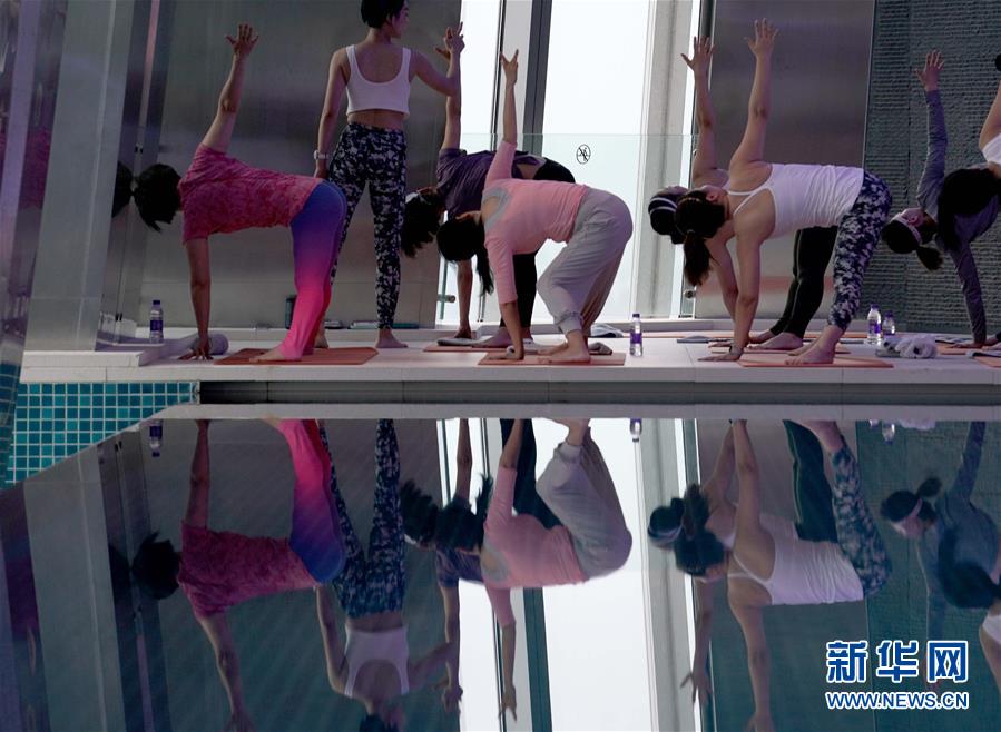 6月9日,在北京國貿(mào)大酒店78層游泳館,瑜伽愛好者練習(xí)瑜伽。