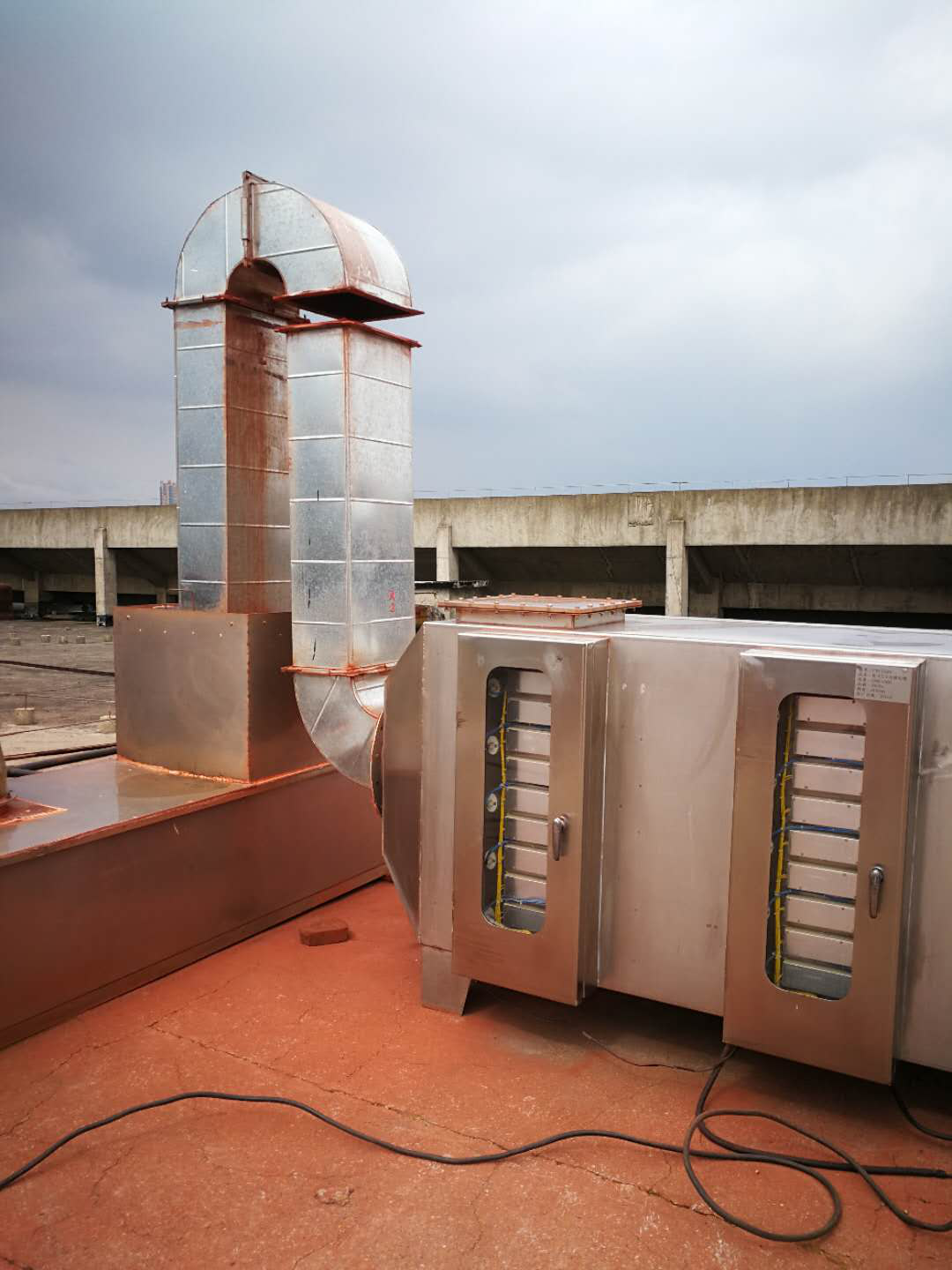 圖為被江西匯仁藥業(yè)有限公司擅自截斷的UV光催化塔進氣管道