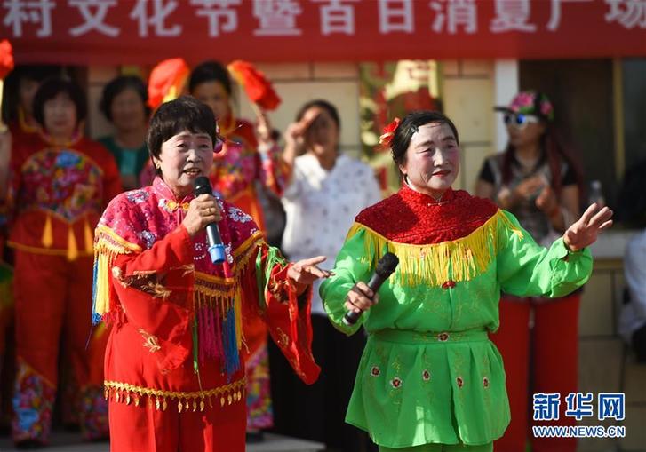 在內(nèi)蒙古鄂爾多斯市杭錦旗獨(dú)貴塔拉鎮(zhèn)芒哈圖村舉辦的“民生集市”上,民間文藝團(tuán)體的演員在表演二人臺(tái)(6月8日攝)。新華社記者 彭源 攝