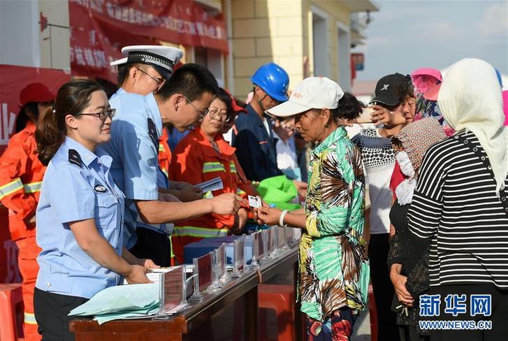在內(nèi)蒙古鄂爾多斯市杭錦旗獨(dú)貴塔拉鎮(zhèn)芒哈圖村,獨(dú)貴塔拉鎮(zhèn)派出所民警在“民生集市”上向群眾發(fā)放新辦理的身份證(6月8日攝)。新華社記者 彭源 攝