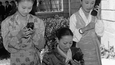 1993年8月14日西藏拉薩正式開通“大哥大”成了新聞?lì)^條(新華社記者 范長國攝),而2018年5月2日,在珠穆朗瑪峰旅游大本營一家?guī)づ衤灭^內(nèi),游客用手機(jī)上網(wǎng)已是司空見慣(新華社記者 黃浩銘 攝)。
