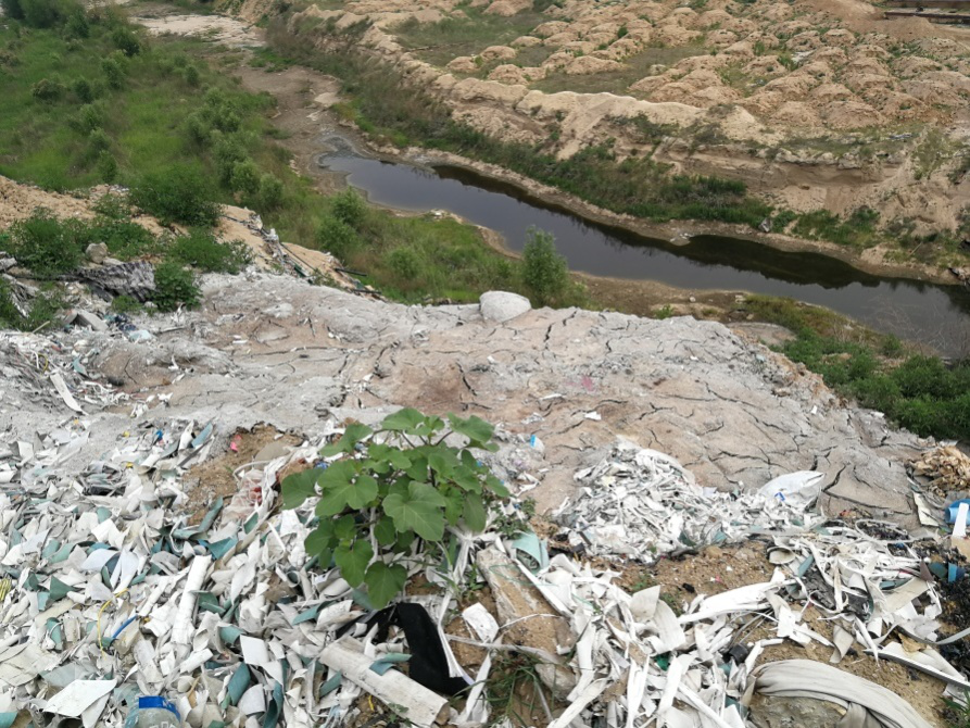 現場檢查發(fā)現,在大沙河定州段遠遠望去,河堤上堆滿了生活垃圾、工業(yè)廢渣、邊角料、醫(yī)療廢物等多種固體廢物,各種垃圾“應有盡有”,形成了一個長約3公里的“垃圾帶”。與長度同樣驚人的,是“垃圾帶”的寬度,垃圾一直從河堤延伸至河床上,斜坡高度達到10米左右。
